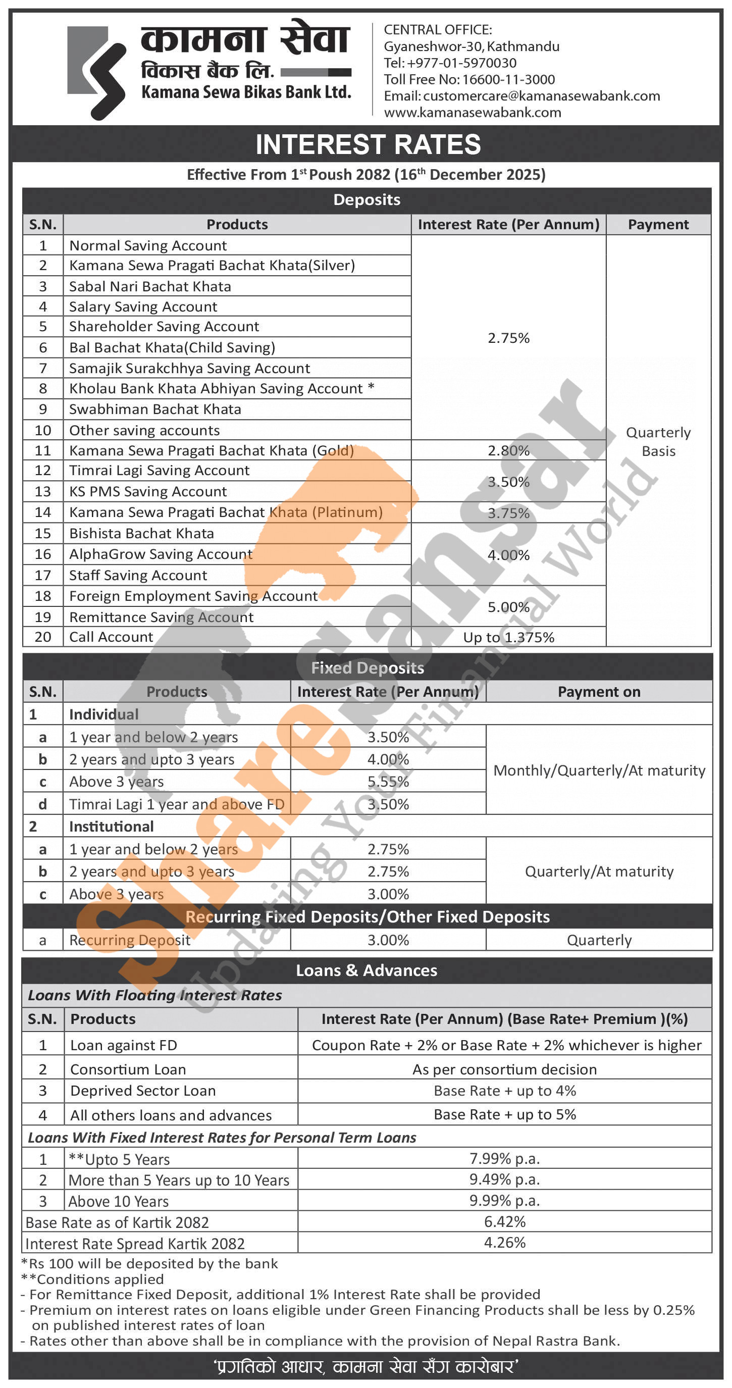 Kamana Sewa Bikas Bank Limited has published a notice regarding the new interest rate for deposit and loan products and it's effective from 1st Poush, 2082.