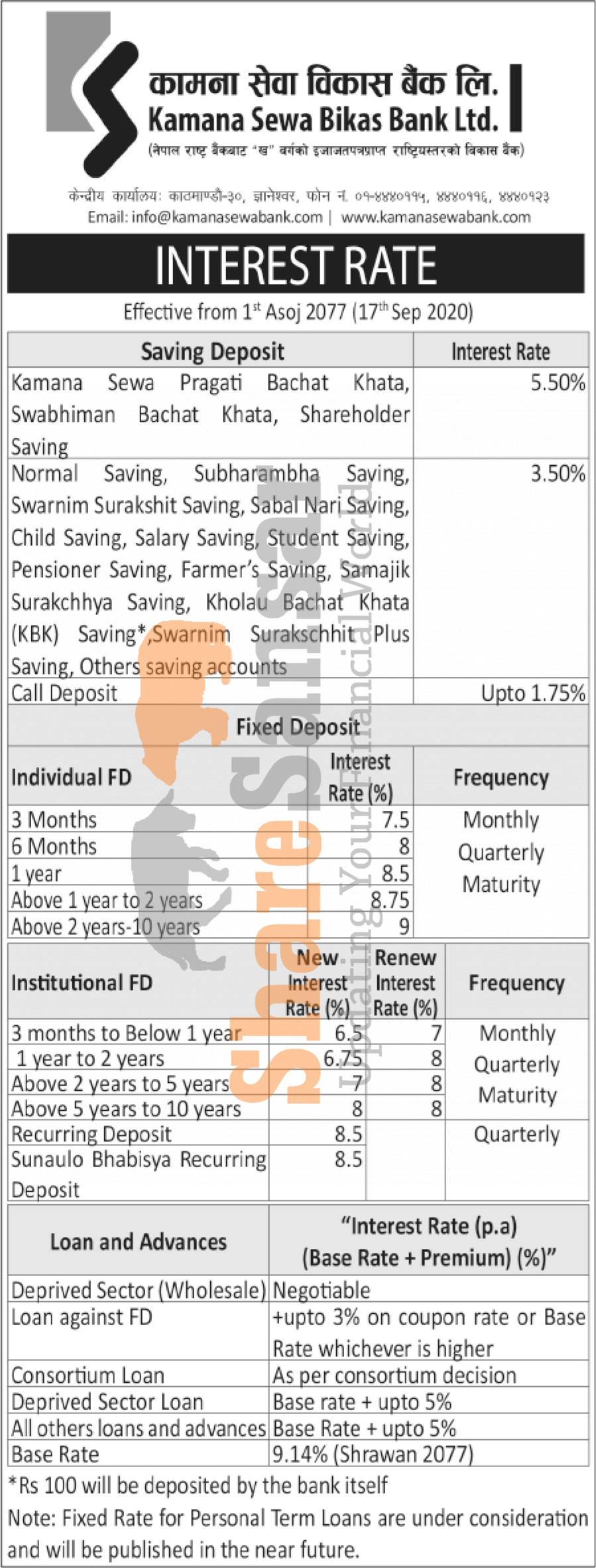 Kamana Sewa Bikas Bank Limited has published a notice regarding the new interest rate for its deposit and loan product and its effective from 1st Ashwin, 2077.