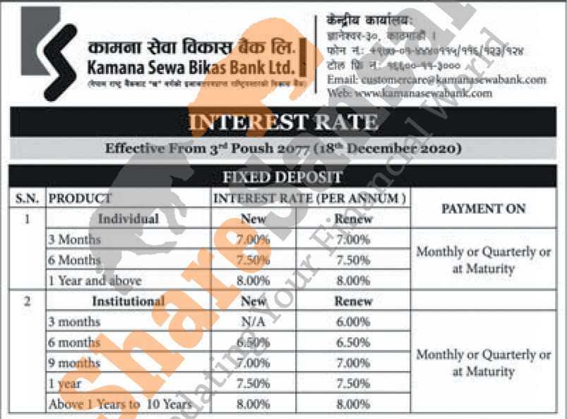 Kamana Sewa Bikas Bank Limited has published a notice regarding the new interest rate for deposit products and it's effective from 3rd Poush, 2077.