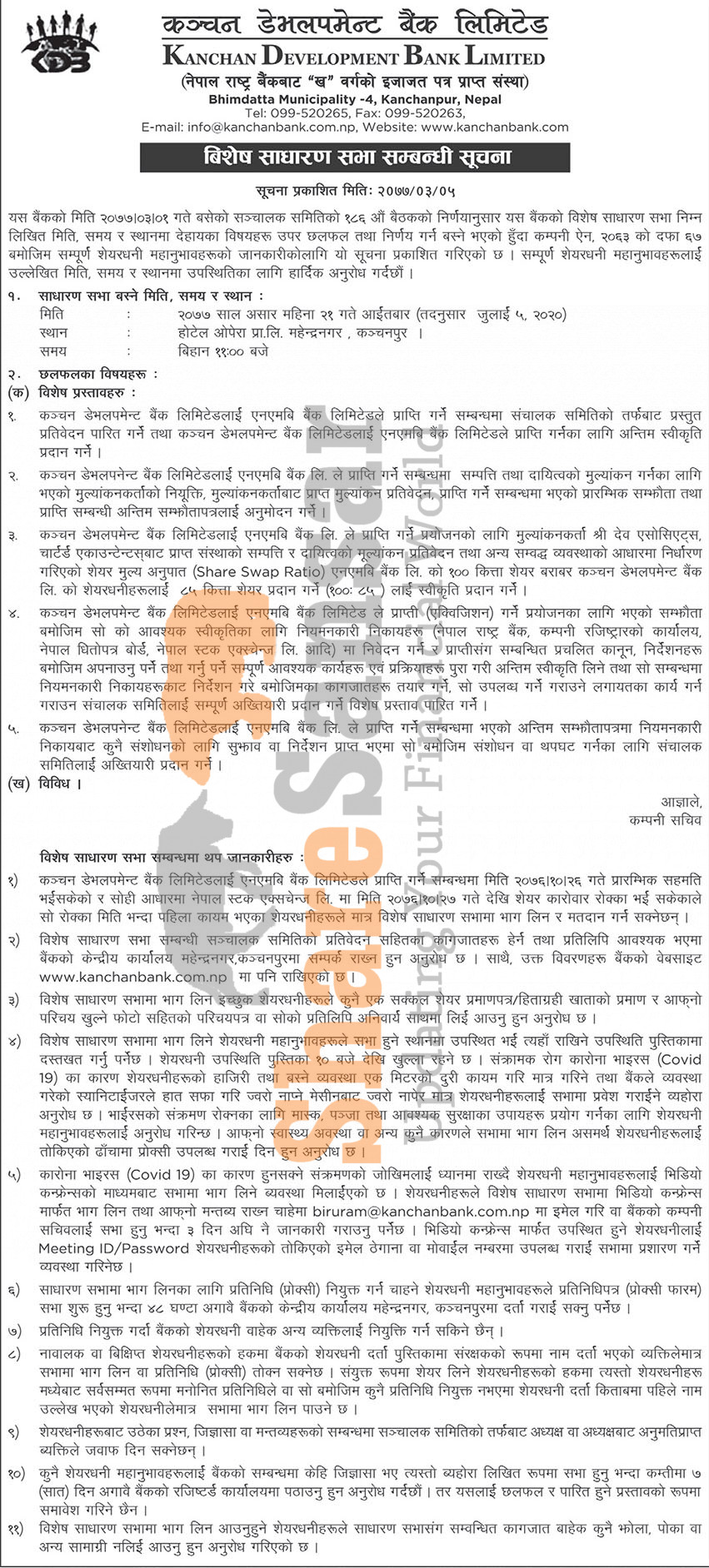 Kanchan Development Bank Limited has announced its Special General Meeting going to be held on 21st Ashad, 2077.