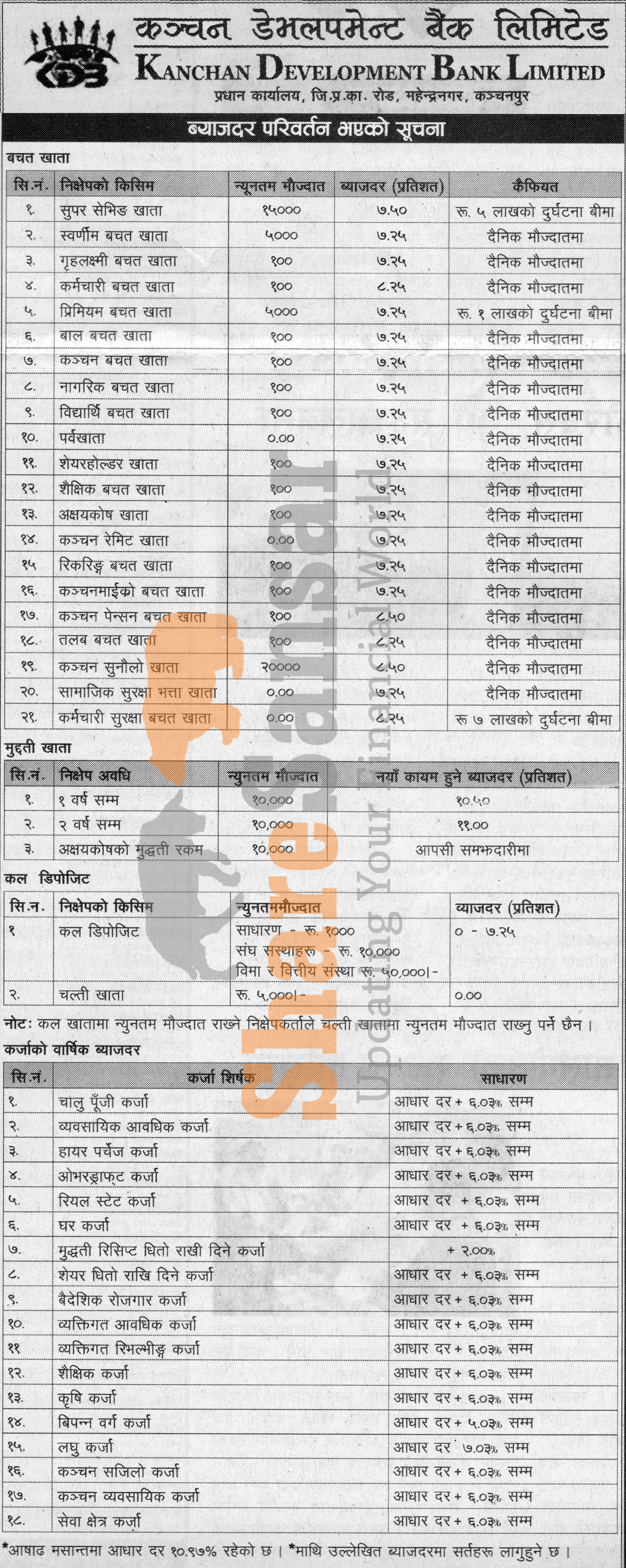 Kanchan Development Bank Limited has published a notice regarding new interest rate.