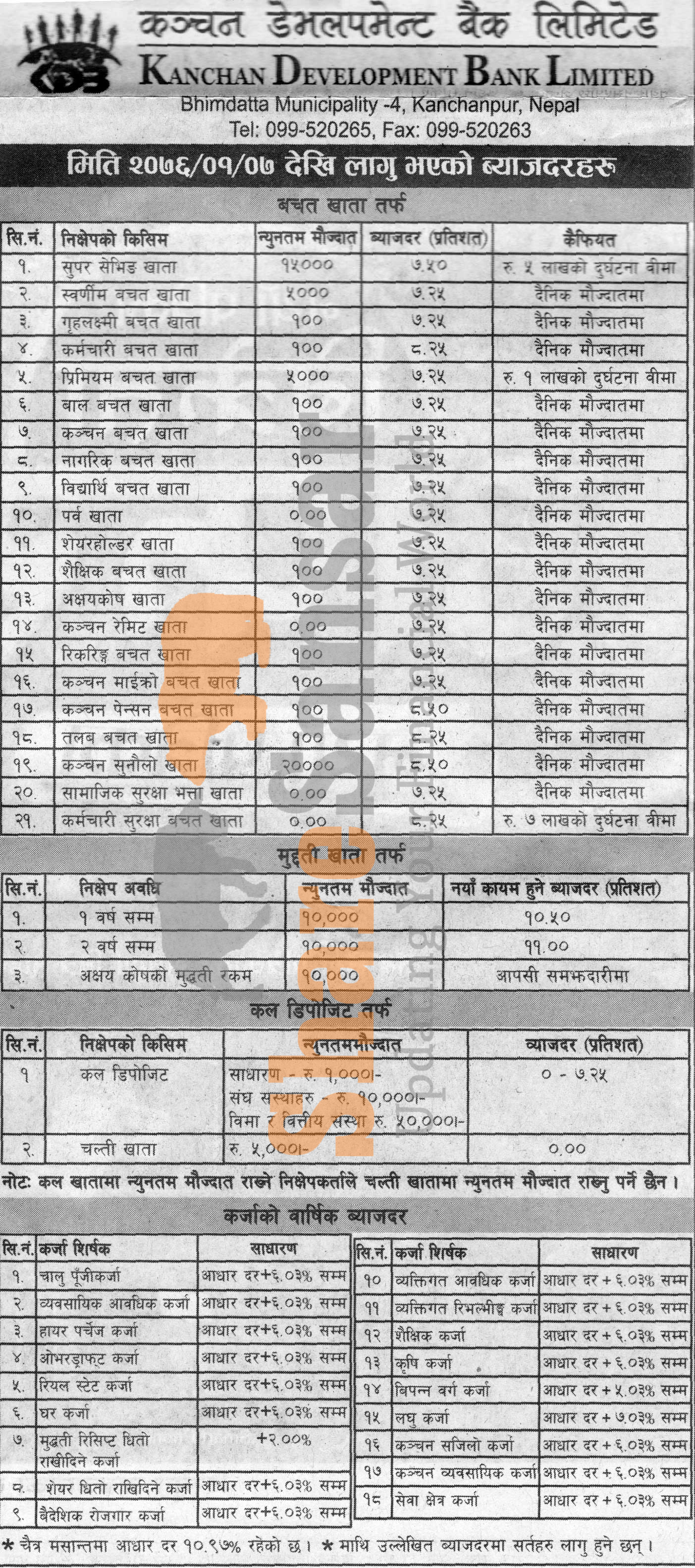 Kanchan Development Bank Limited has published a notice regarding new interest rate and its effective from 7th Baishakh, 2076.