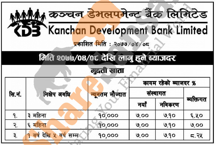 Kanchan Development Bank Limited has published a notice regarding the interest rate on the various fixed deposit products and its effective from 8th Shrawan, 2077.