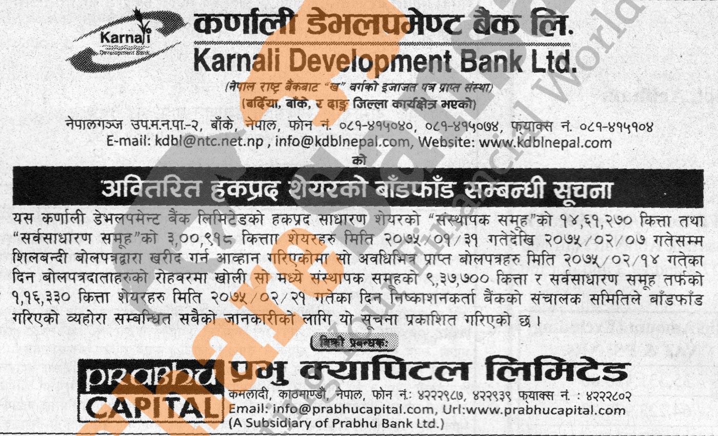 Karnali Development Bank Limited has allotted its 9,37,700 units promoter share and 1,16,330 units ordinary share in auction to the general public on 21st Jestha, 2075.