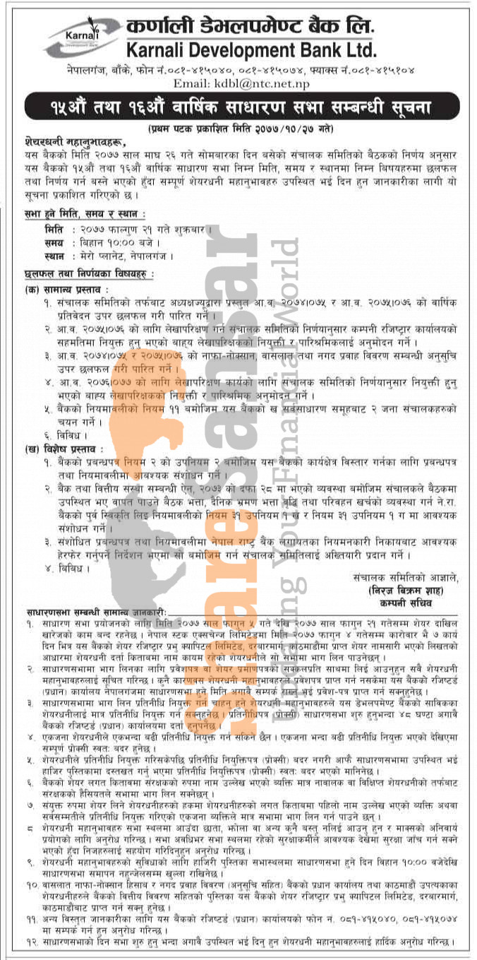 Karnali Development Bank Limited has announced its 15th and 16th AGM going to be held on 21st Falgun, 2077.