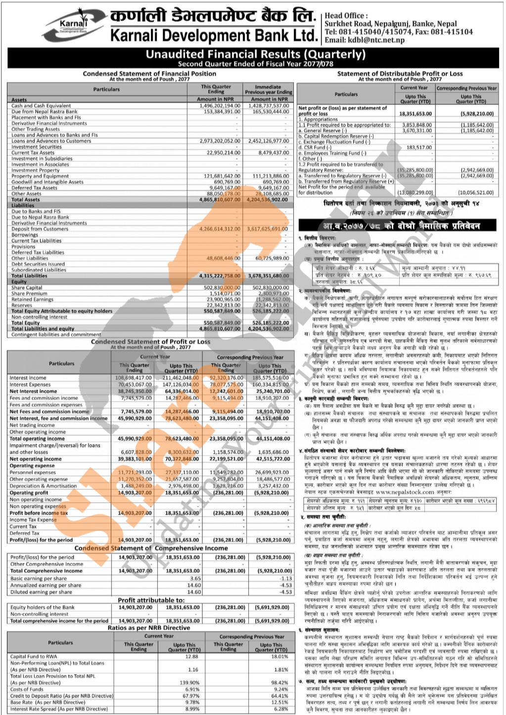 Karnali Development Bank Limited has posted a net profit of Rs 18.35 million and published its 2nd quarter company analysis of the fiscal year 2077/78.