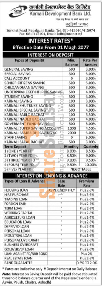 Karnali Development Bank Limited has published a notice regarding the new interest rate for deposit and loan products and it's effective from 1st Magh, 2077.