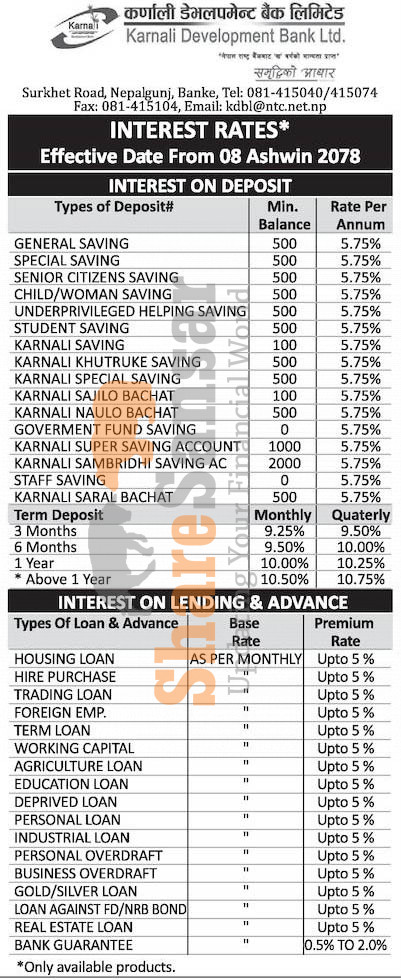 Karnali Development Bank Limited has published a notice regarding the new interest rate for deposit and loan products and it's effective from 8th Ashwin, 2078.