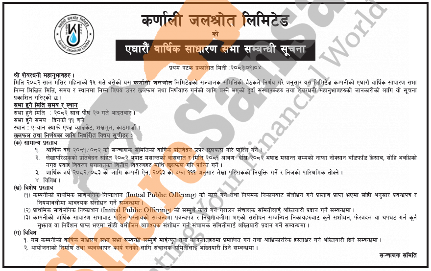 Karnali Jalsrot Limited has announced its 11th AGM going to be held on 27th Poush, 2082.