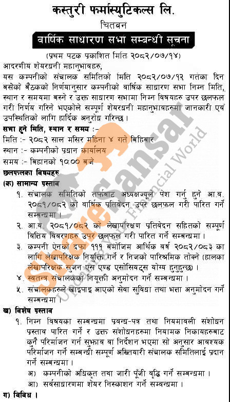 Kasturi Pharmaceuticals Limited has announced its AGM going to be held on 4th Mangsir, 2082.
