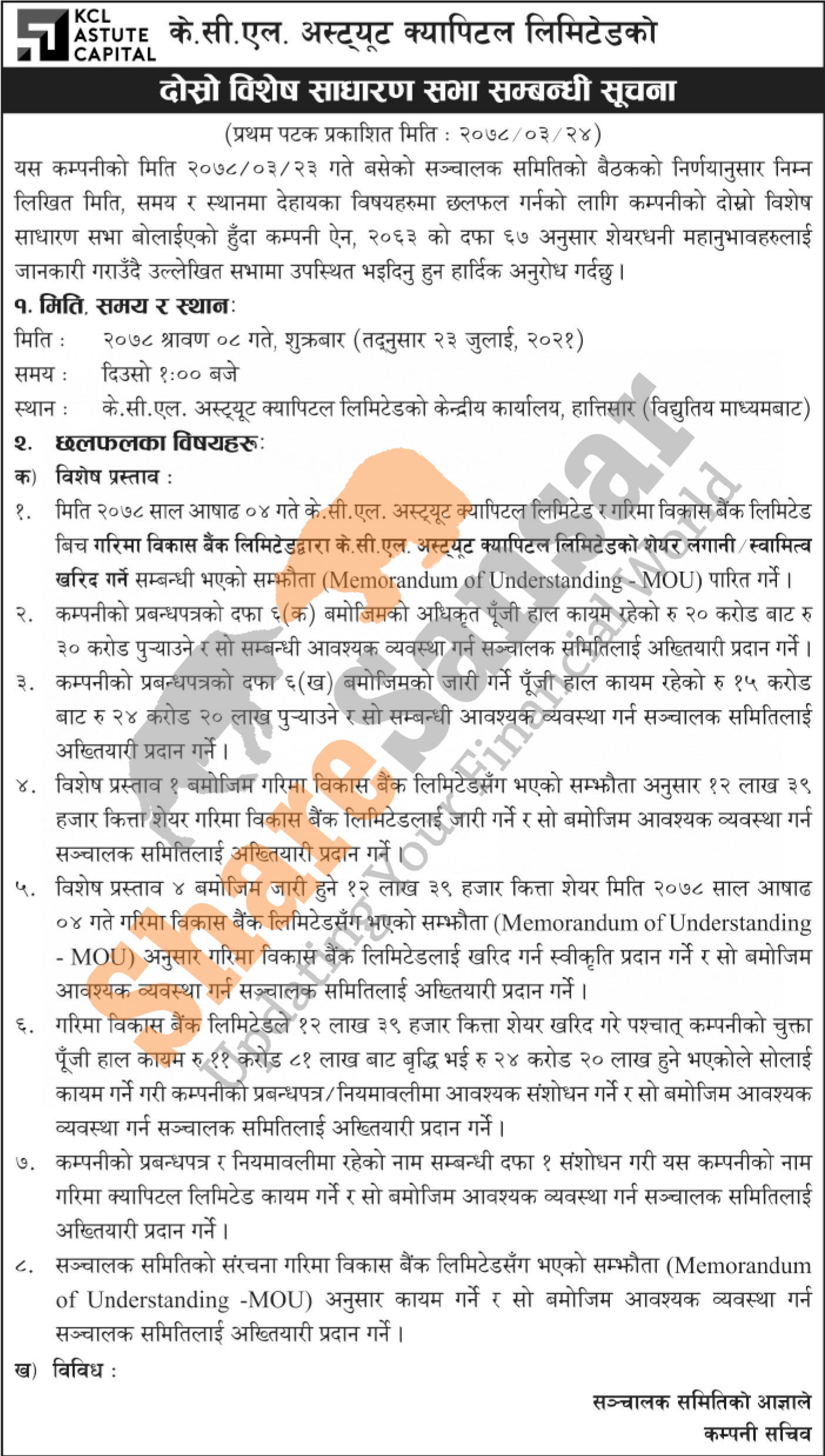 K.C.L. Astute Capital Limited has announced its 2nd SGM going to be held on 8th Shrawan, 2078.