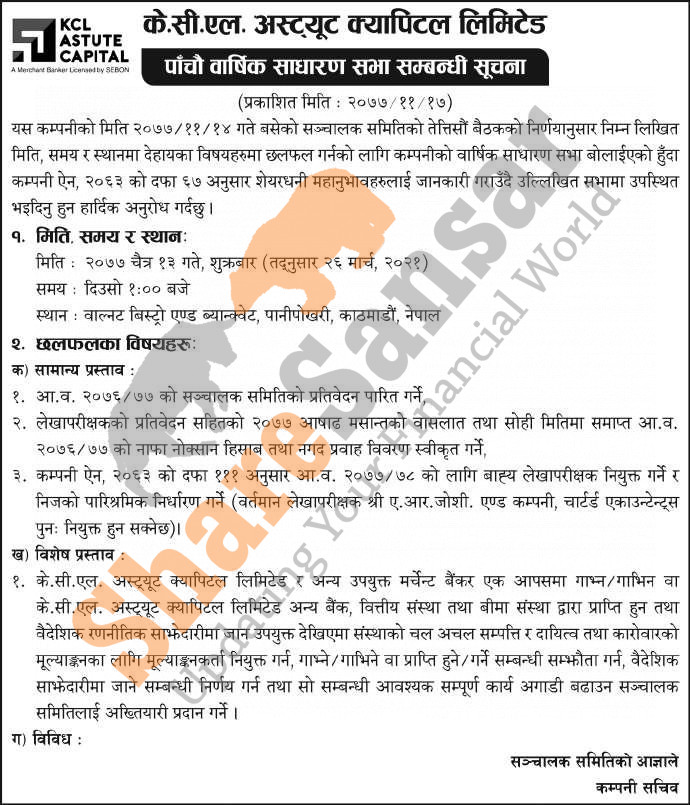 K.C.L. Astute Capital Limited has announced its 5th AGM going to be held on 13th Chaitra, 2077