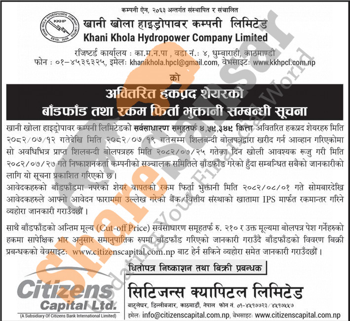Khani Khola Hydropower Company Limited has allotted its 4,59,349 units of ordinary shares (unsold right shares) in an auction to the interested person/company/institutions on 27th Kartik, 2082 and also has published a notice regarding its auction cut-off price.