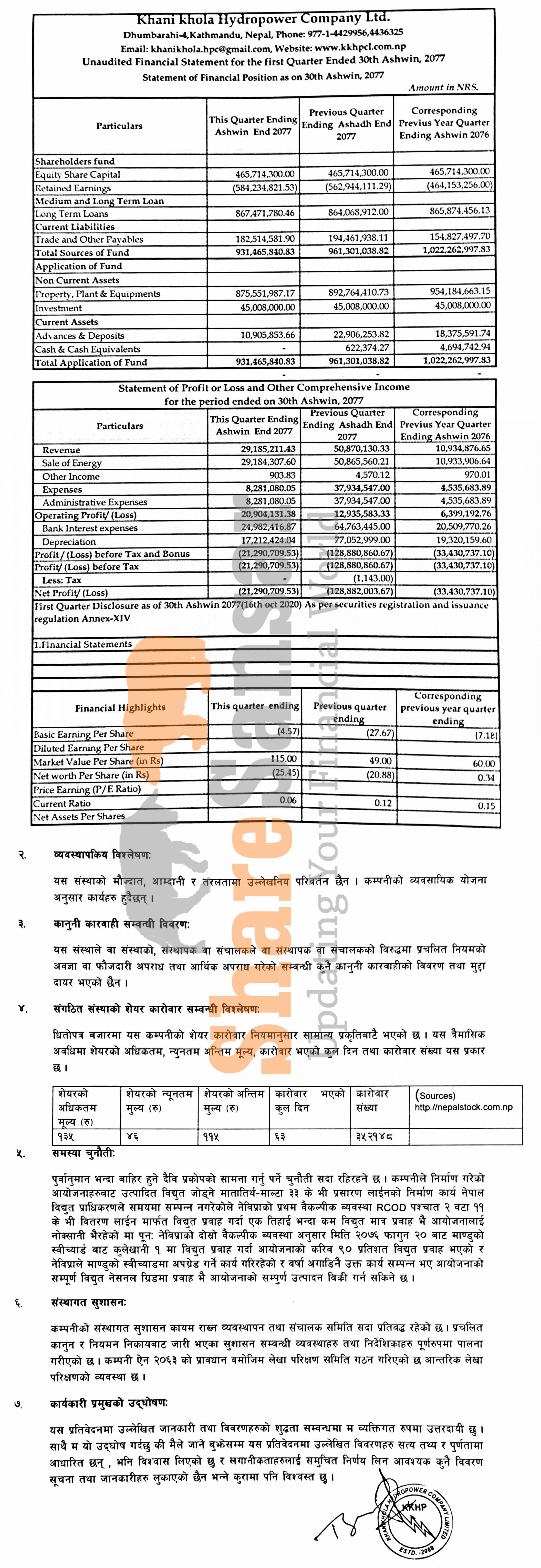 Khani Khola Hydropower Company Limited has posted a net loss of Rs 21.29 million and published its 1st quarter company analysis of the fiscal year 2077/78.