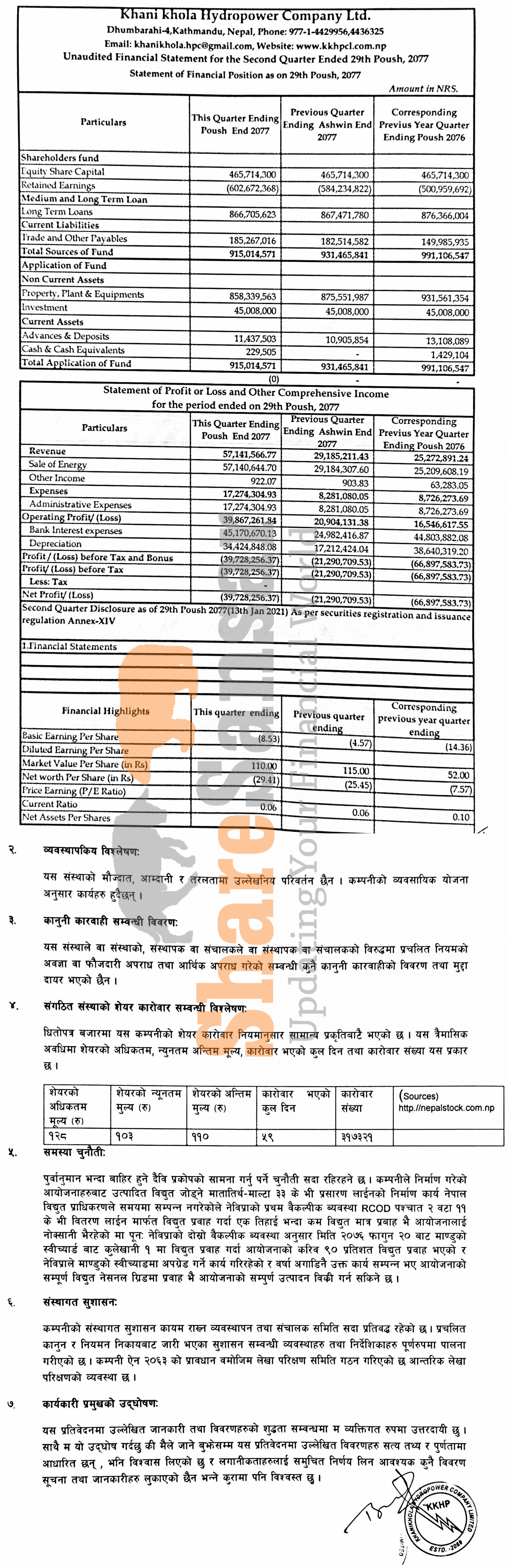 Khani Khola Hydropower Company Limited has posted a net loss of Rs 39.72 million and published its 2nd quarter company analysis of the fiscal year 2077/78.