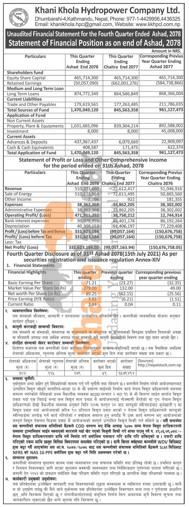 Khani Khola Hydropower Company Limited has posted a net profit of Rs 331.62 million and published its 4th quarter company analysis of the fiscal year 2077/78.