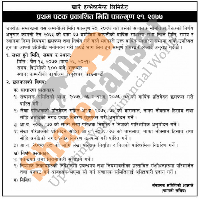 Khare Investment Limited has announced its Annual General Meeting going to be held on 13th Chaitra, 2077.
