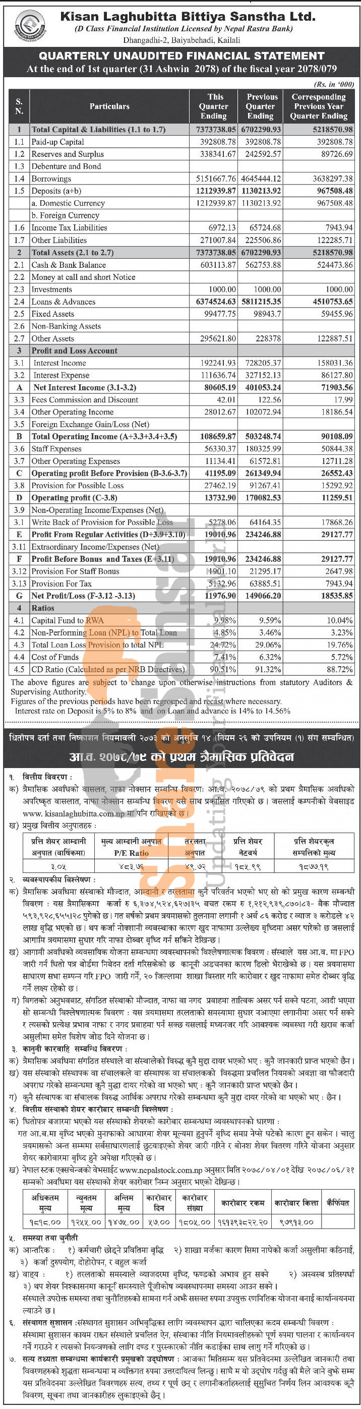 Kisan Laghubitta Bittiya Sanstha Limited has posted a net profit of Rs 11.97 million and published its 1st quarter company analysis of the fiscal year 2078/79.