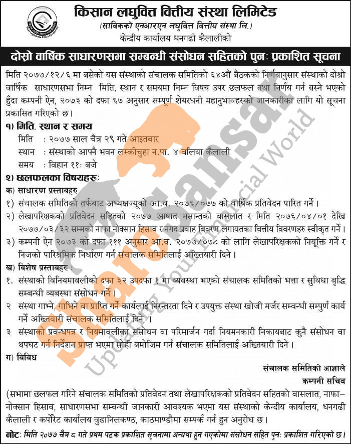 Kisan Laghubitta Bittiya Sanstha Limited has published a notice regarding amendment on its 2nd AGM notice.
