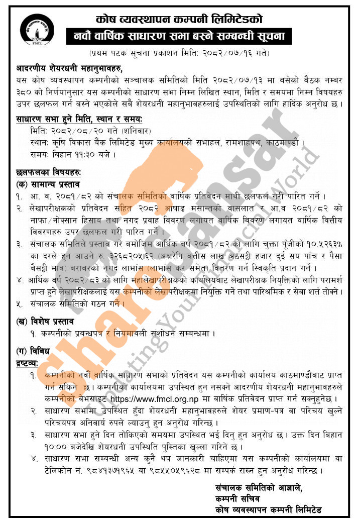 Kosh Bewasthapan Company Limited has announced its 9th AGM going to be held on 20th Mangsir, 2082.