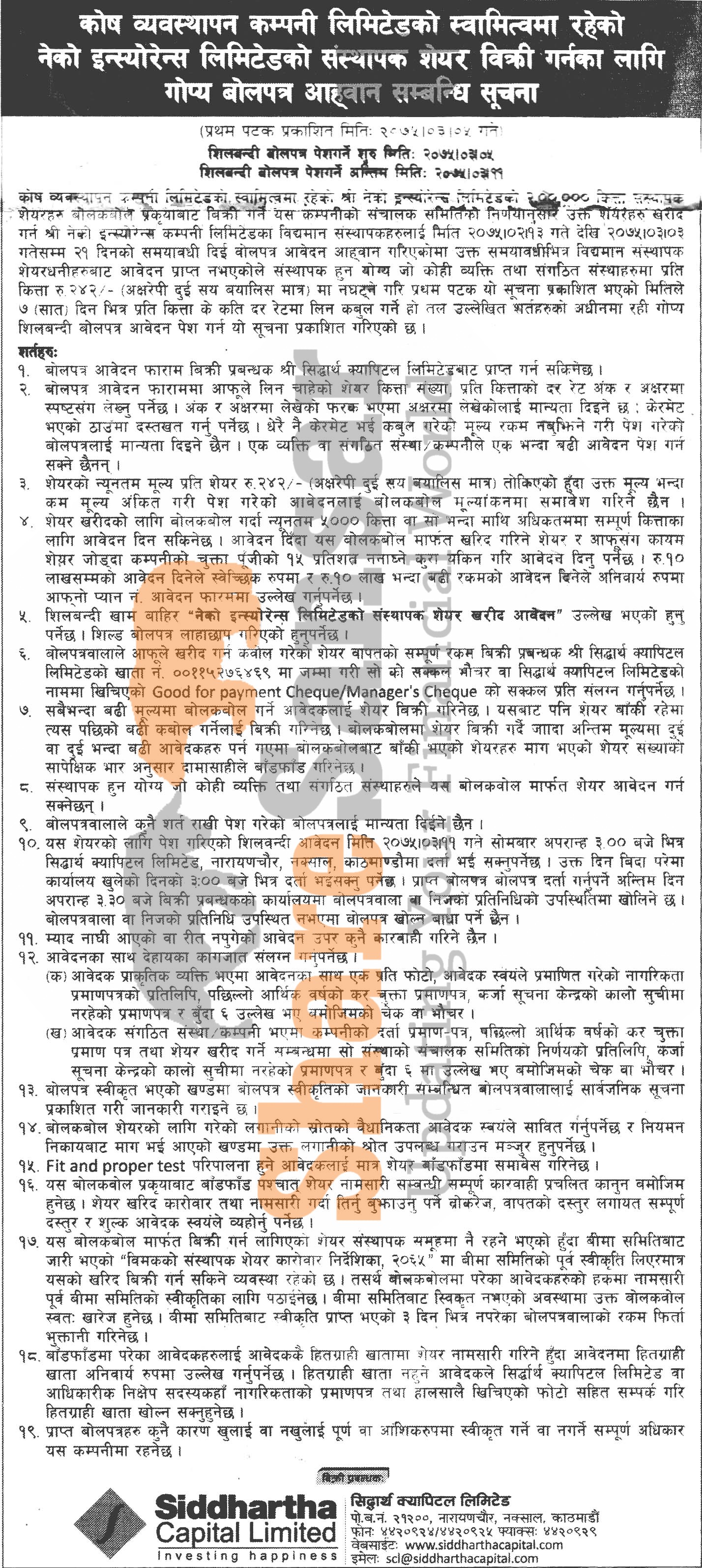 Kosh Bewasthapan Company Limited is selling 2,00,000 units Promoter shares of (Neco Insurance Limited) in auction to the general public from (5th to 11th Ashad, 2075).