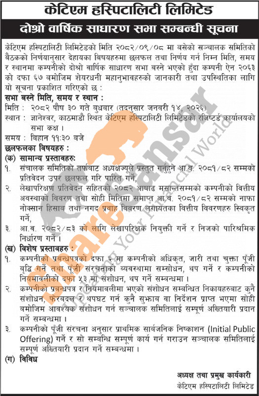 Ktm Hospitality Limited has announced its 2nd AGM going to be held on 30th Poush, 2082.