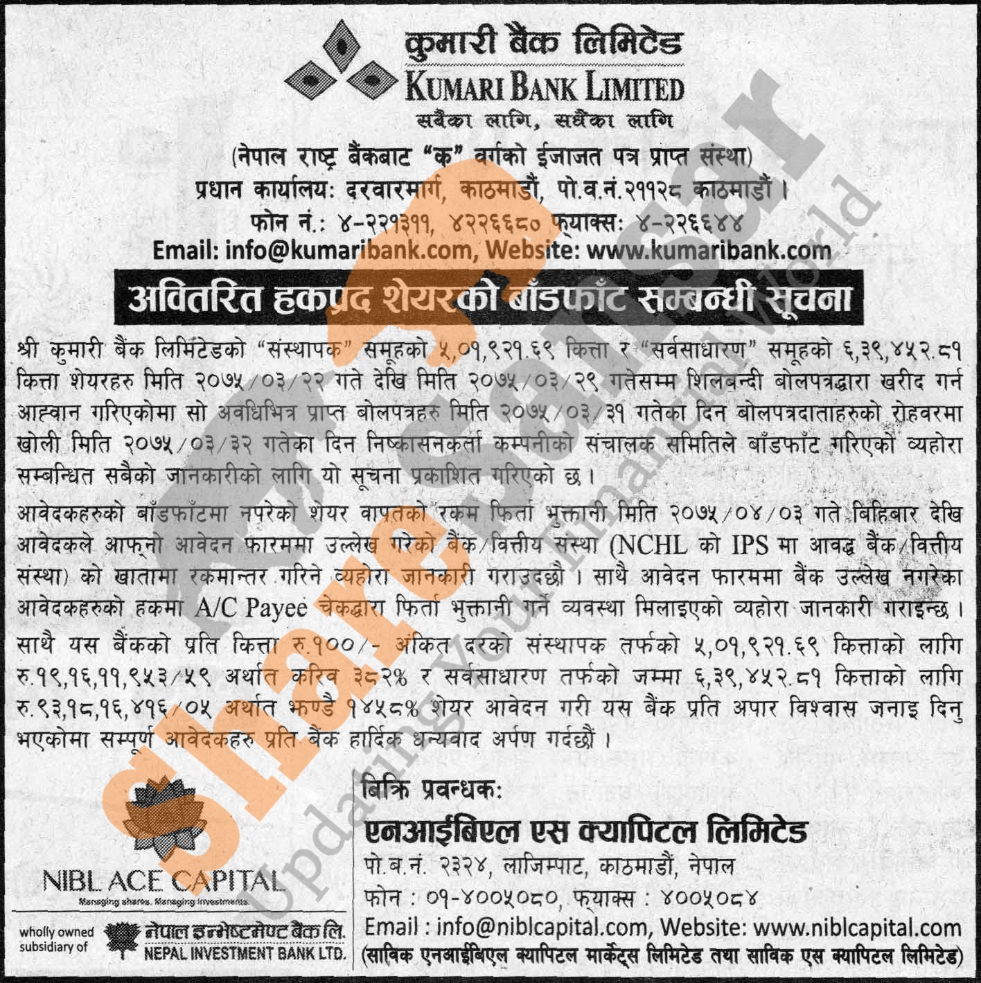 Kumari Bank Limited has allotted its 5,01,921.69 units promoter share and 6,39,452.81 units ordinary share in auction to the general public on 32nd Ashad, 2075 and refunding money to the non-allottee investors from 3rd Shrawan, 2075.
