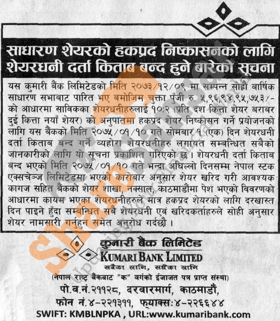 Kumari Bank Limited has announced a book closure date for its upcoming 10:2 ratio right share on 10th Baishakh, 2075.