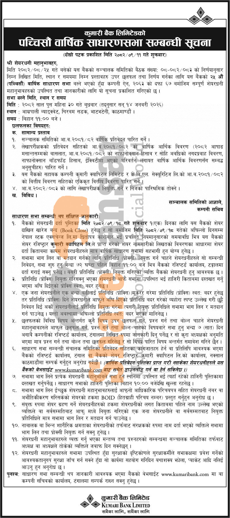 Kumari Bank Limited has announced its 25th AGM going to be held on 30th Poush, 2082.