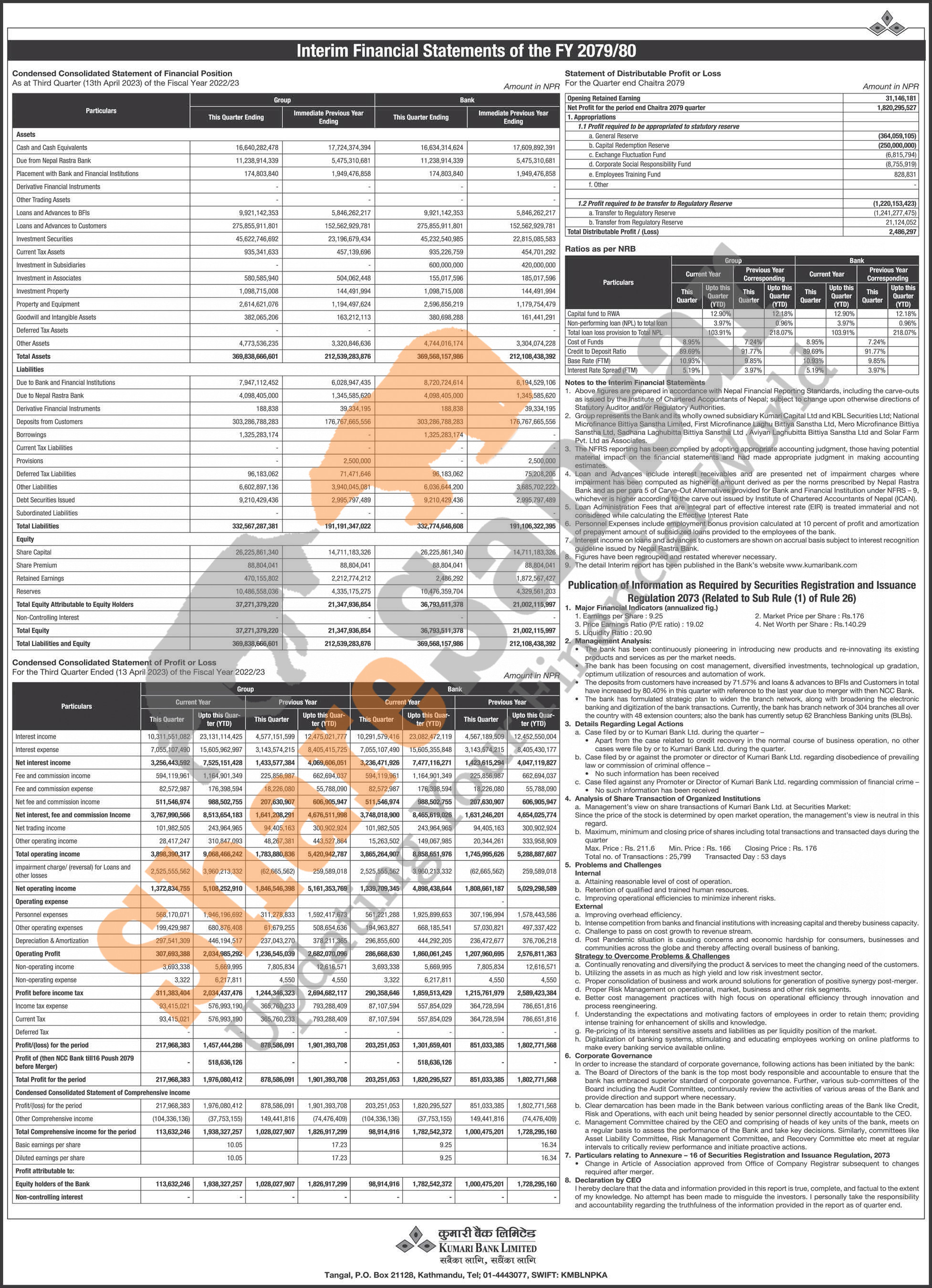 Kumari Bank Limited has posted a net profit of Rs 1.82 billion and published its 3rd quarter company analysis of the fiscal year 2079/80.