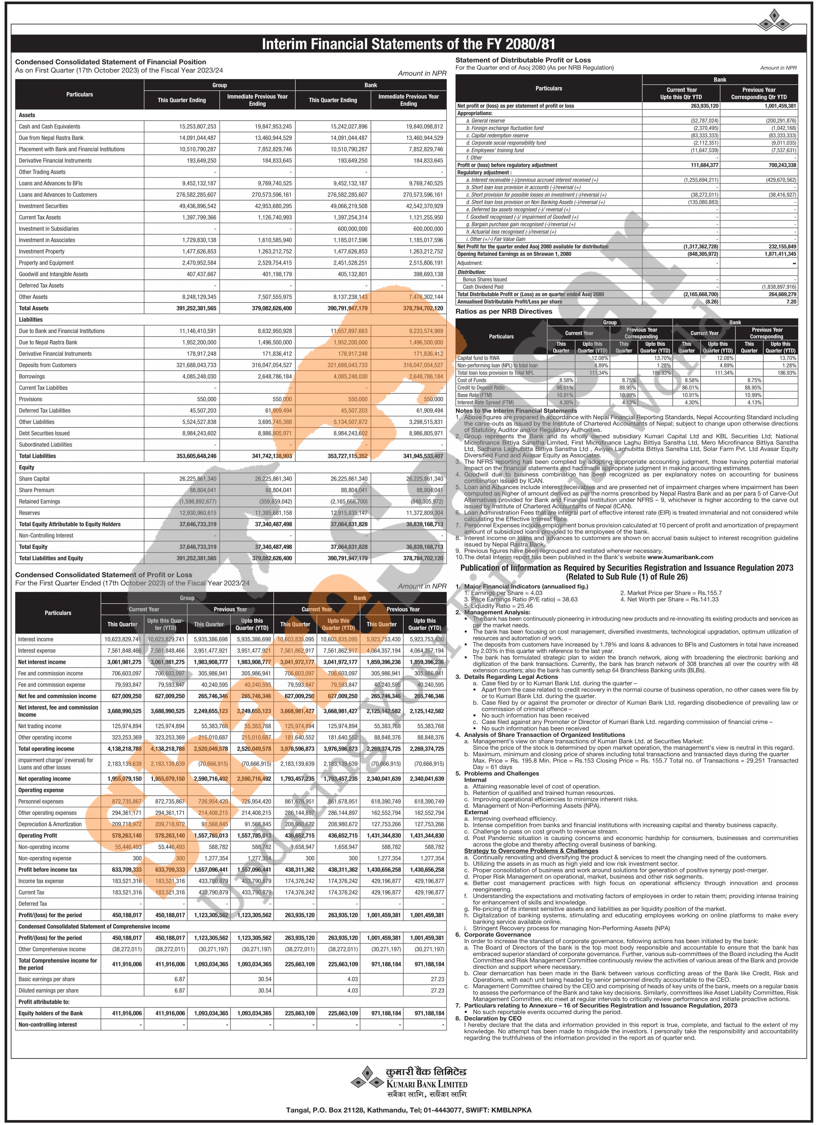 Kumari Bank Limited has posted a net profit of Rs 263.93 million and published its 1st quarter company analysis of the fiscal year 2080/81.