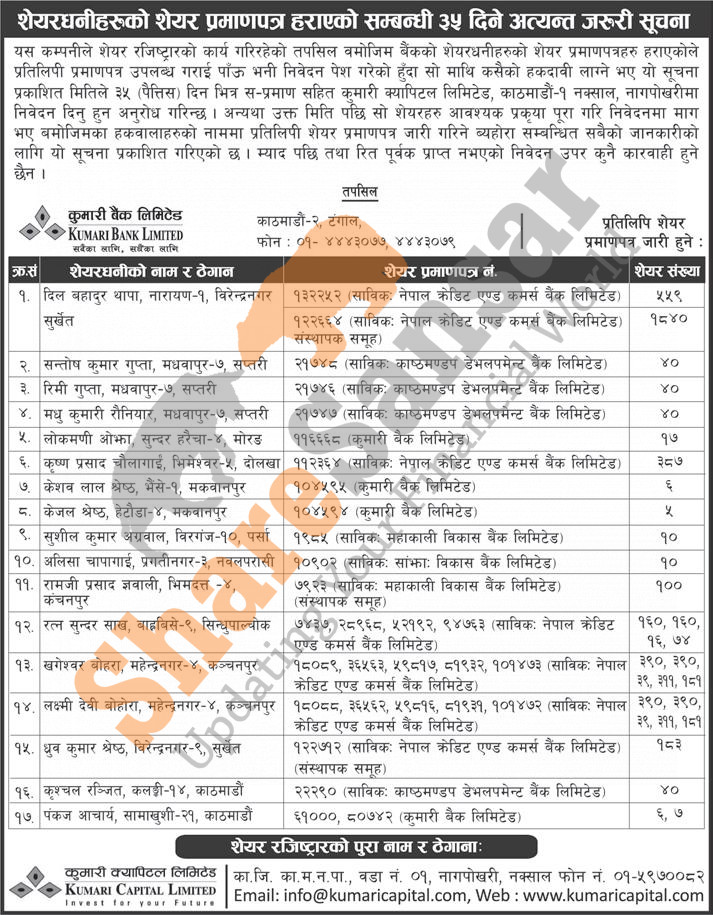 Kumari Bank Limited has published a notice regarding a claim for lost share certificates.