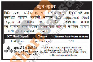 Kumari Bank Limited has published a notice regarding correction on its interest rate on LCY Institutional Fixed Deposit which was published on 30th Kartik, 2082.