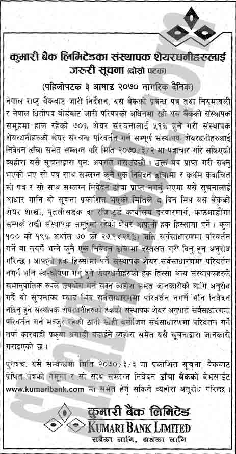 Kumari Bank Limited has published a notice regarding its share structure to its promoter shareholders.
