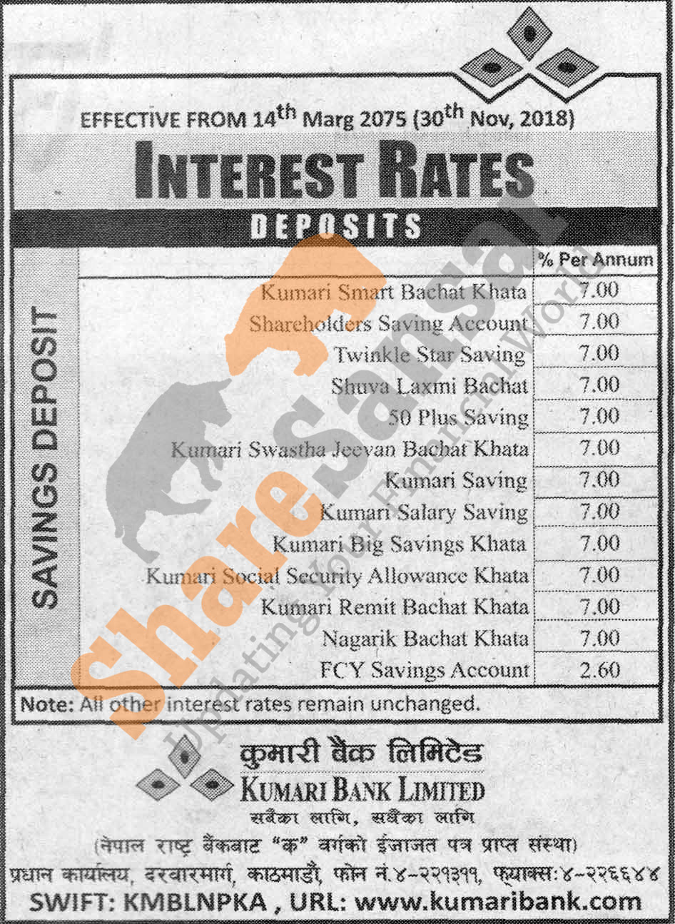 Kumari Bank Limited has published a notice regarding new interest rate and its effective from 14th Mangsir, 2075.