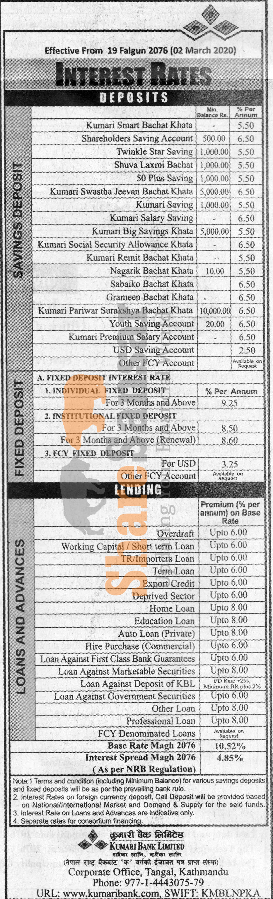 Kumari Bank Limited has published a notice regarding new interest rate and its effective from 19th Falgun, 2076.