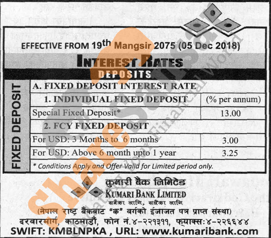 Kumari Bank Limited has published a notice regarding new interest rate and its effective from 19th Mangsir, 2075.