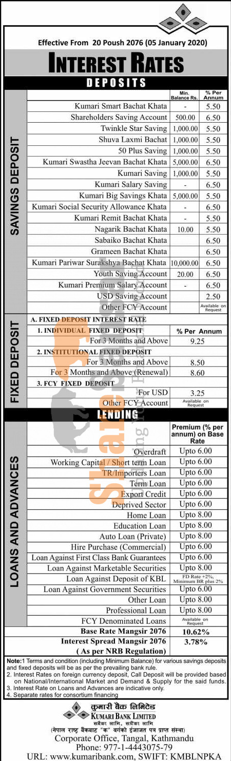 Kumari Bank Limited has published a notice regarding new interest rate and its effective from 20th Poush, 2076.