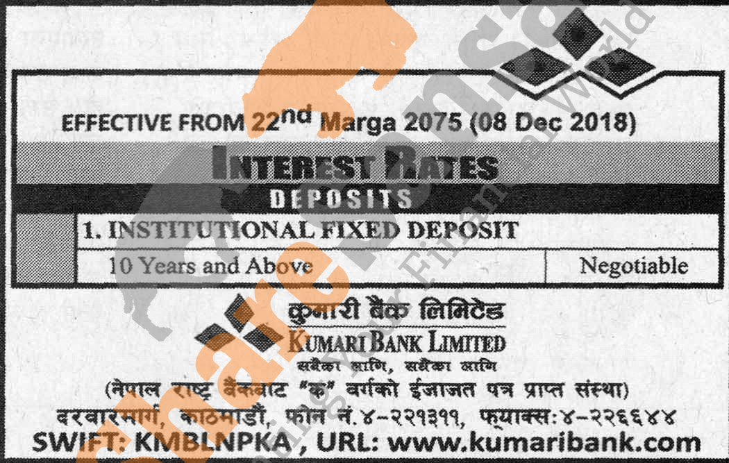 Kumari Bank Limited has published a notice regarding new interest rate and its effective from 22nd Mangsir, 2075.