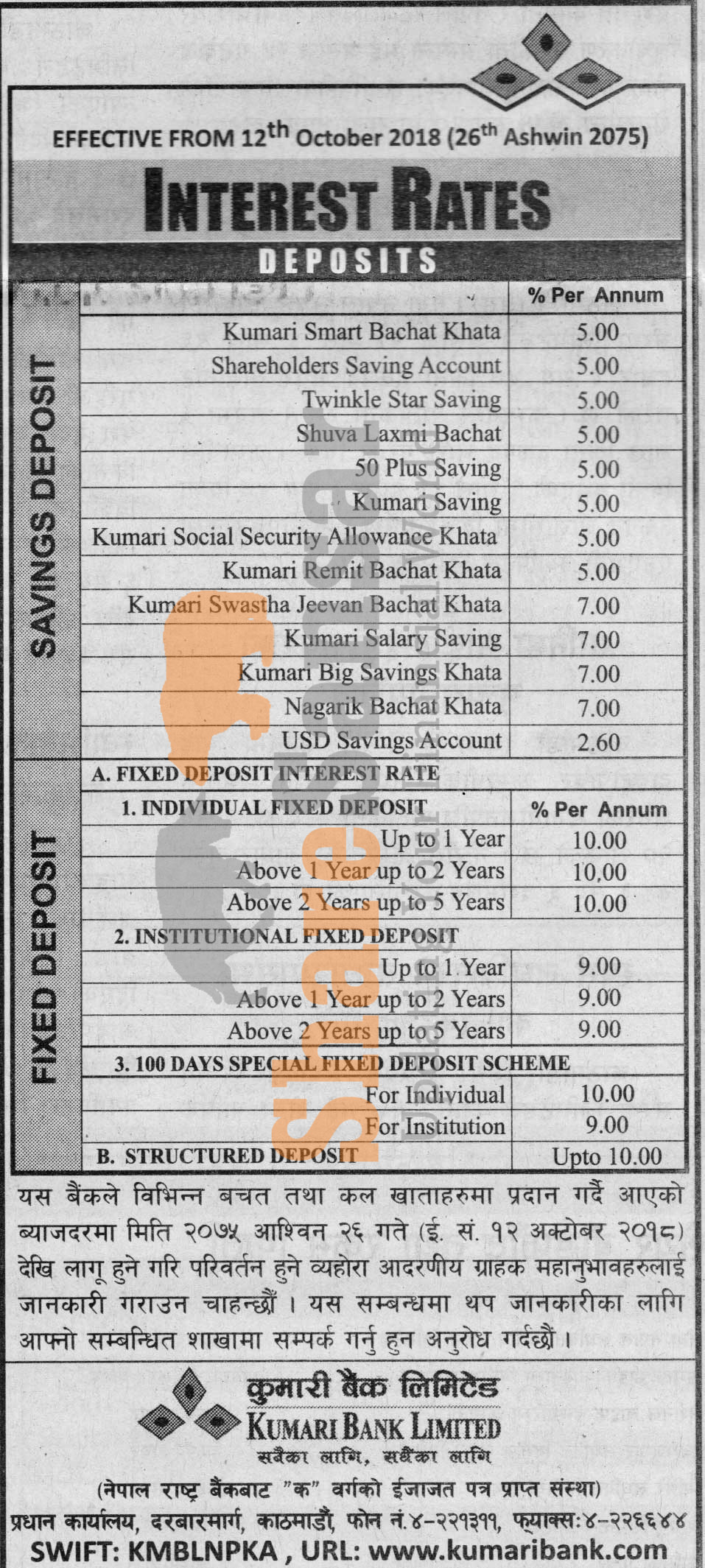 Kumari Bank Limited has published a notice regarding new interest rate and its effective from 26th Ashwin, 2075.