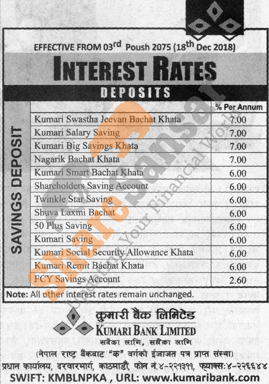 Kumari Bank Limited has published a notice regarding new interest rate and its effective from 3rd Poush, 2075.