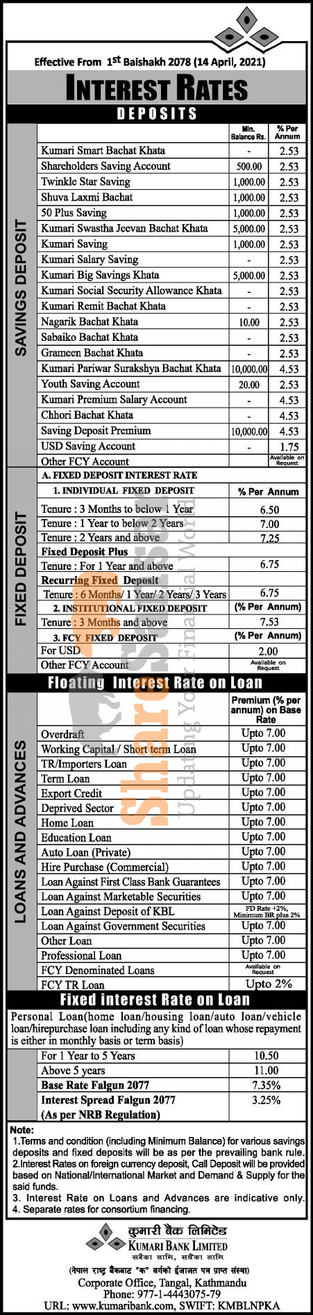 Kumari Bank Limited has published a notice regarding the new interest rate for deposit and loan products and it's effective from 1st Baisakh, 2078