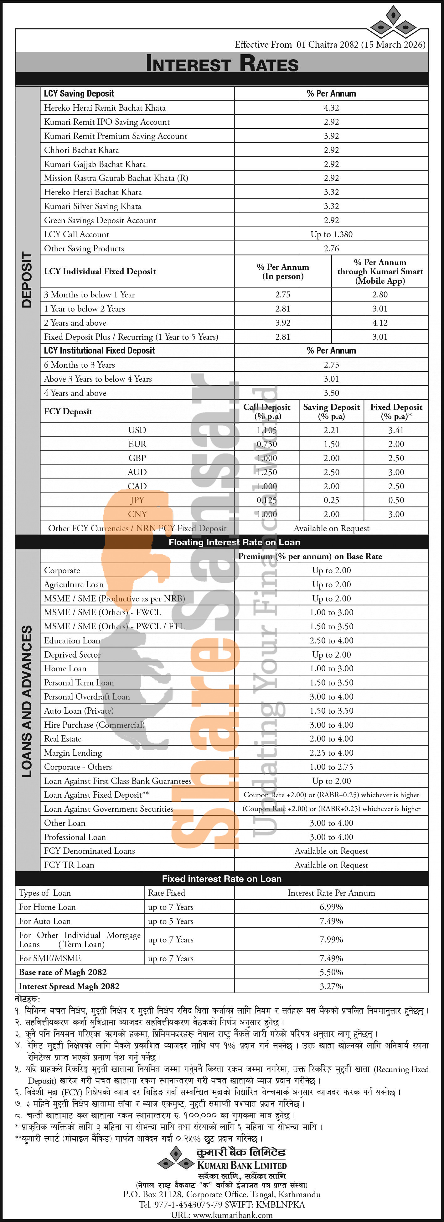 Kumari Bank Limited has published a notice regarding the new interest rate for deposit and loan products and it's effective from 1st Chaitra, 2082.