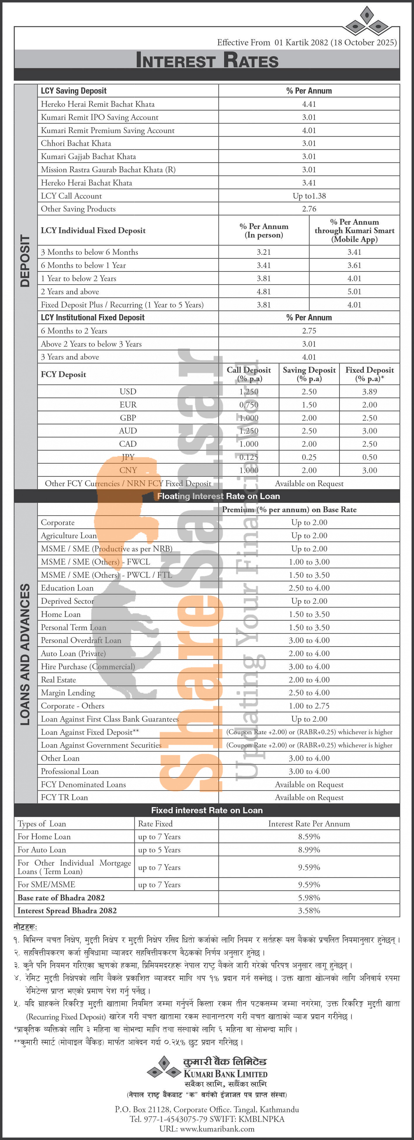 Kumari Bank Limited has published a notice regarding the new interest rate for deposit and loan products and it's effective from 1st Kartik, 2082.