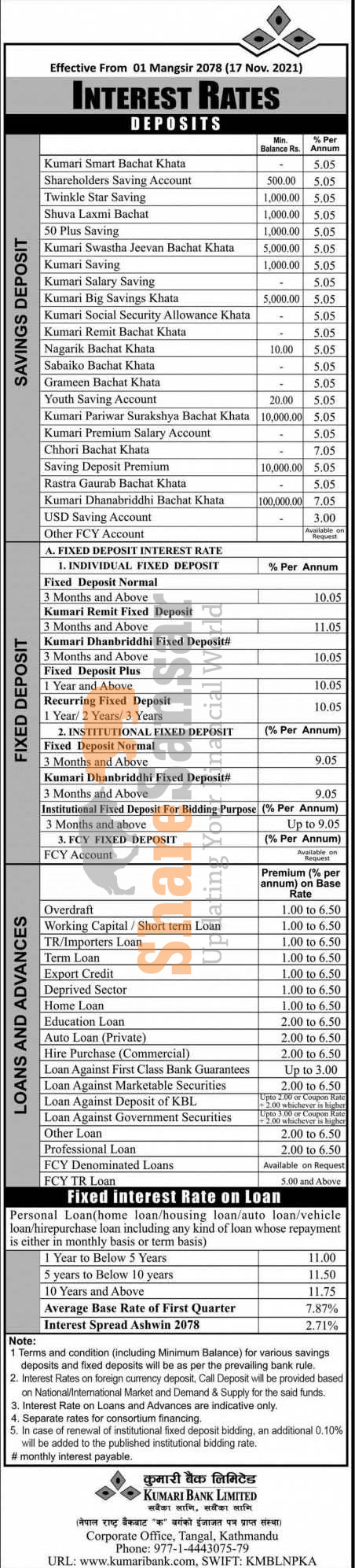 Kumari Bank Limited has published a notice regarding the new interest rate for deposit and loan products and it's effective from 1st Mangsir, 2078.
