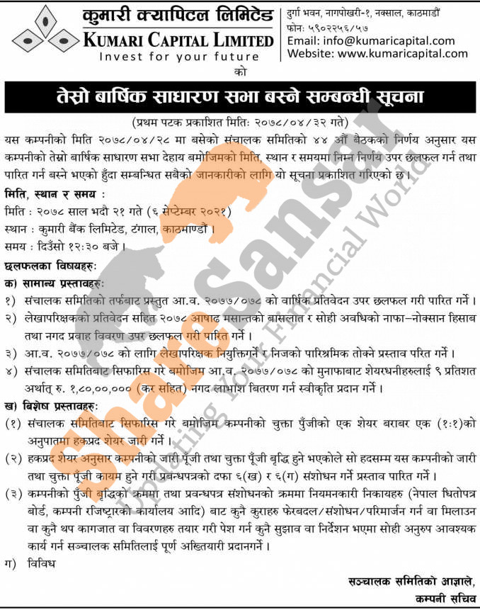 Kumari Capital Limited has announced its 3rd AGM going to be held on 21st Bhadra, 2078.