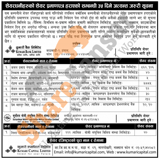 Kumari Capital Limited has published a notice regarding a claim for lost share certificates.