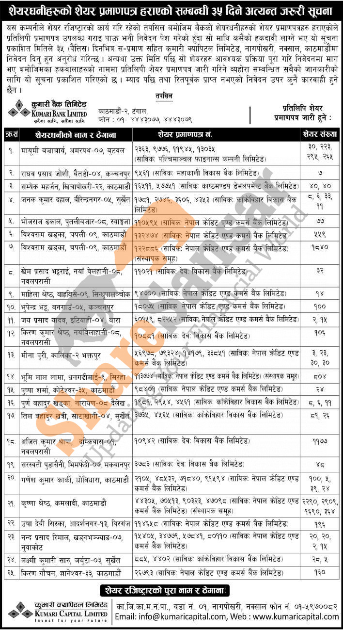 Kumari Capital Limited has published a notice regarding a claim for lost share certificates.