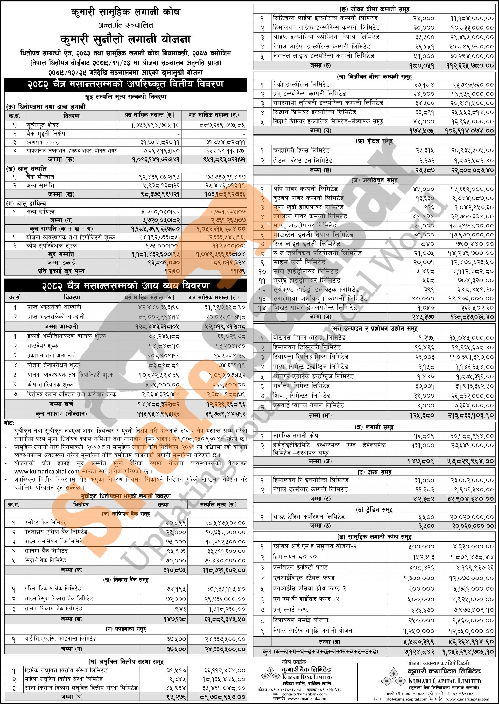 Kumari Capital Limited has published “Kumari Sunaulo Lagani Yojana” Net Asset Value (NAV) till Chaitra, 2082.