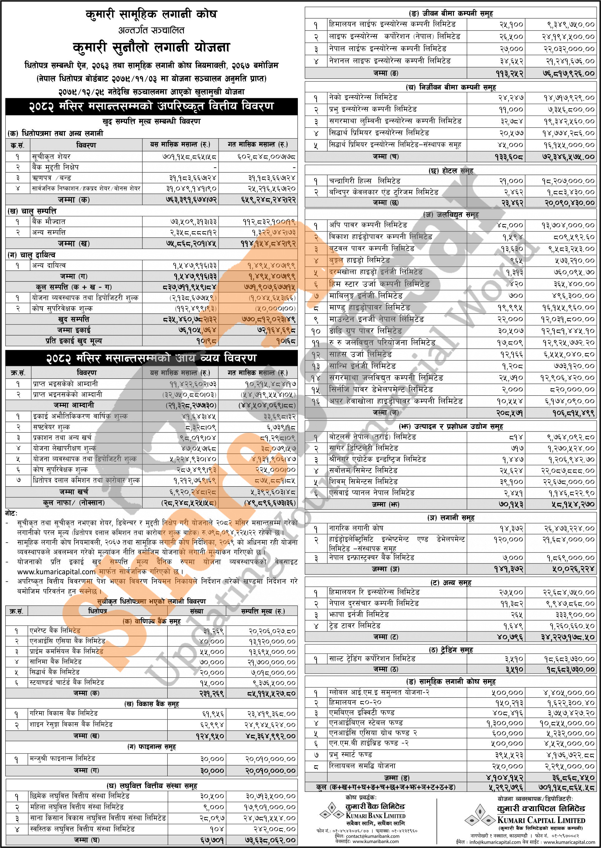 Kumari Capital Limited has published “Kumari Sunaulo Lagani Yojana” Net Asset Value (NAV) till Mangsir, 2082.